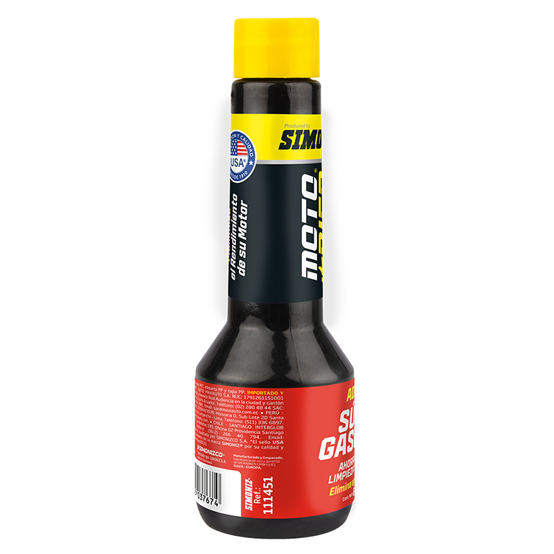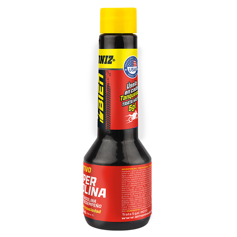 SIMONIZ® MOTO BIEN® ADITIVO 5 EN 1 SUPER GASOLINA mejora combina el poder de 5 aditivos en 1: restaura potencia, ahorra combustible, previene la aparición de depósitos de etanol, inhibe la corrosión y limpia el sistema.