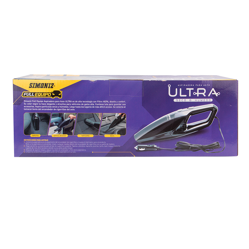 Simoniz Full Equipo Aspiradora para Auto ULTRA es de alta tecnología con Filtro HEPA, diseño y confort. Su color negro la hace elegante y atractiva para vehículos de gama alta. Contiene tula para guardar sus accesorios. Aspira partículas secas y húmedas. Llega hasta los lugares de más difícil acceso. Se conecta al tomacorriente del encendedor de cigarrillos del auto.