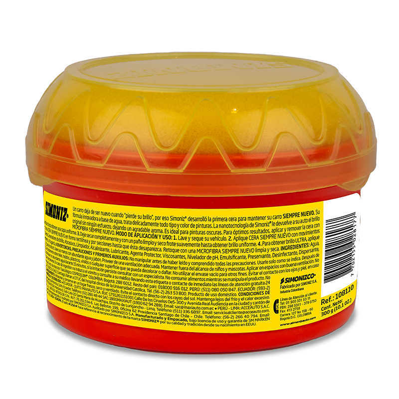Esta cera crema tiene una fórmula innovadora a basa de agua; trata delicadamente todo tipo de color de pintura. La Nanotecnología de SIMONIZ le devuelve a su auto el brillo original sin ningún esfuerzo; renueva la pintura dañada, revive el color y deja un agradable aroma, proporcionando una capa ultra resistente con filtro UV. Es ideal para pintura oscuras. Para óptimos resultados aplicar y remover la cera con microfibra.