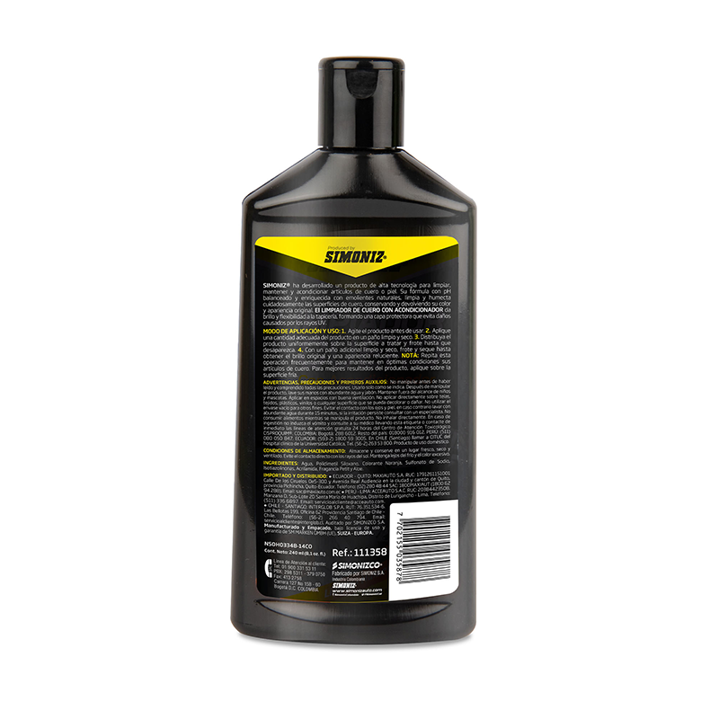 SIMONIZ® ha desarrollado un producto de alta tecnología para limpiar, mantener y acondicionar artículos de cuero o piel. Su fórmula con pH balanceado, limpia y humecta cuidadosamente las superficies de cuero conservando y devolviendo su color y apariencia original. El LIMPIADOR DE CUERO CON ACONDICIONADOR da brillo y flexibilidad a la tapicería, formando una capa protectora que evita daños causados por los rayos solares.