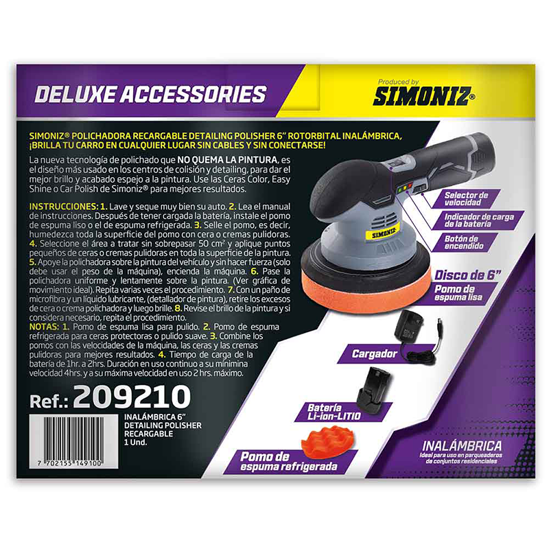 SIMONIZ® POLICHADORA RECARGABLE DETAILING POLISHER 6” ROTORBITAL INALÁMBRICA, ¡BRILLA TU CARRO EN CUALQUIER LUGAR SIN CABLES Y SIN CONECTARSE! La nueva tecnología de polichado que NO QUEMA LA PINTURA, es el diseño más usado en los centros de colisión y detailing, para dar el mejor brillo y acabado espejo a la pintura. Use las Ceras Color, Easy Shine o Car Polish de Simoniz® para mejores resultados.