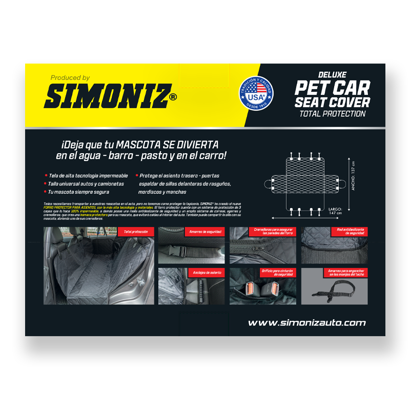 Todos necesitamos transportar a nuestras mascotas en el auto, pero no tenemos como proteger la tapicería, SIMONIZ® ha creado un nuevo forro protector para asientos con la más alta tecnología y materiales, ¡Ya no tenemos que preocuparnos por llevar nuestras mascotas a divertirse en el agua, barro o pasto! Es forro protector cuenta con un sistema de protección de 3 capas que lo hace 100% impermeable, además posee un amalla antideslizante de seguridad y un amplio sistema de correas, agarres y cremalleras, que crea un hamaca protectora para su mascota, que evitara caídas al interior del auto. También puede compartir la silla con su mascota, abriendo una de sus cremalleras. Diseñado con una medida única que sirve para autos y camionetas, en su asiento trasero o maletero.